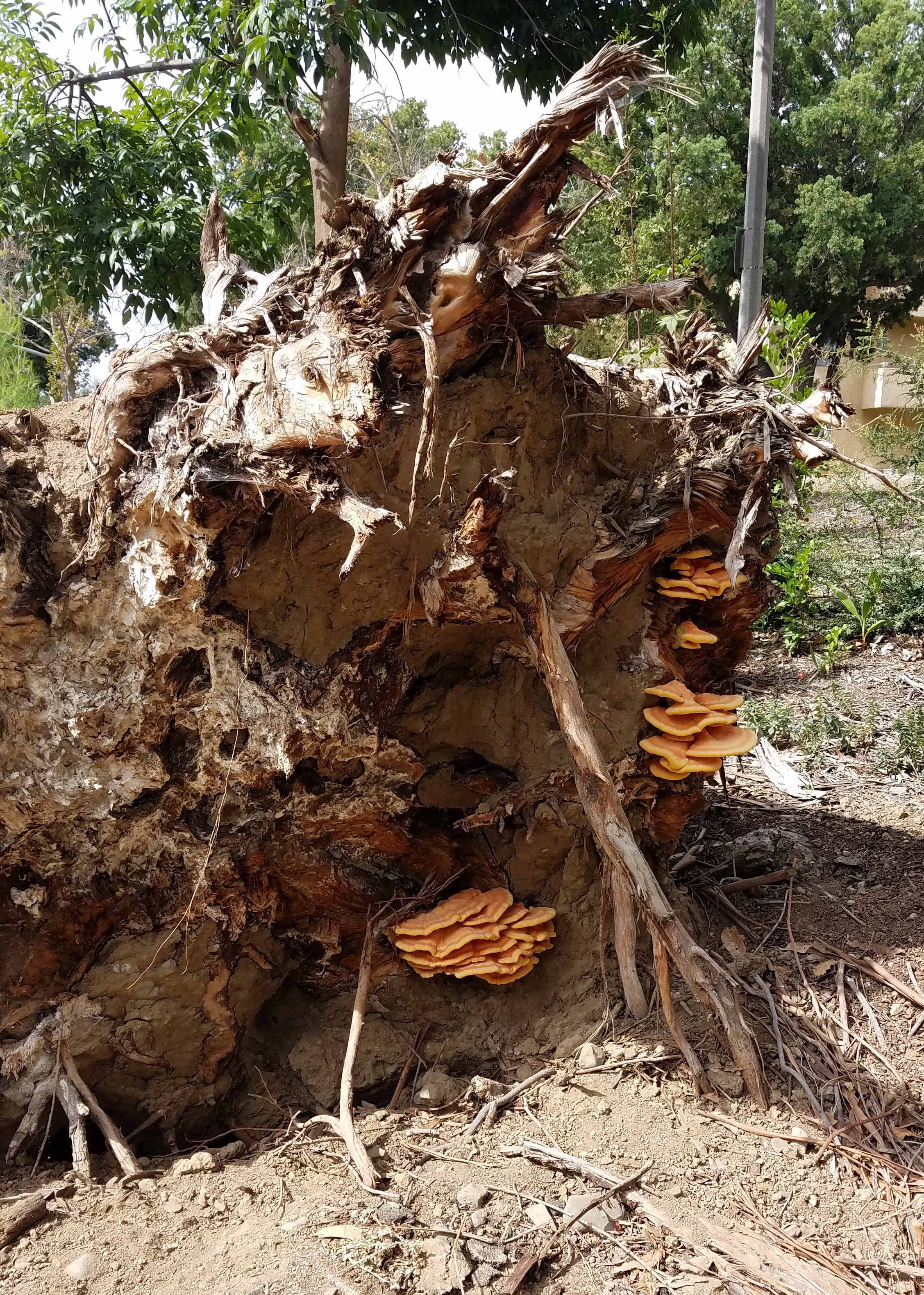 While Sulfur Shelf is considered one of the “foolproof” mushroom varieties – without any dangerous, or really, any lookalikes – there are caveats. Don’t eat it raw, for one thing; like feathered chicken, this one also needs to be cooked. Also, some mycology authorities consider sulfur shelf growing on conifers more likely to cause illness. The wetland park in Orange County, California doesn’t have a lot of conifers, but that wasn’t my major concern anyway. My issue has to do with foraging in urban environments.