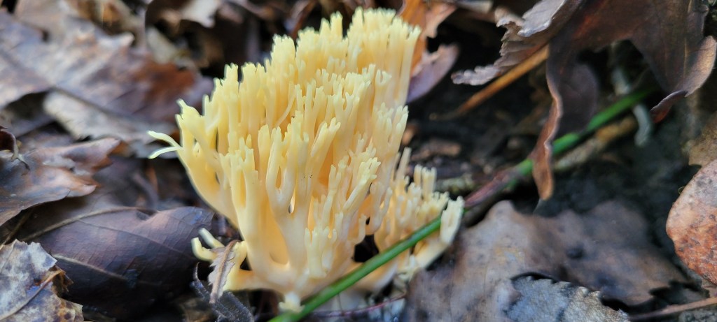 (A longer aside on naming than usual: “hydnoid” means “resembling a hydnum” – go figure – and Hydnum is the name of a genus of mushroom that I suppose was the first “toothy” mushroom group ever made. The word “Hydnum” is a New Latin adaptation of the Greek word “hudnon”, which means “truffle” (1). Truffle mushrooms grow underground and bear their spores internally, not on external toothlike surfaces, so this is where the etymology completely loses me. The species name peckii comes from the last name of a famous mycologist, Charles Horton Peck, who died just five years after this species was discovered and named after him. Peck certainly deserves the honor, as he himself described more than 3000 North American fungi (1).)