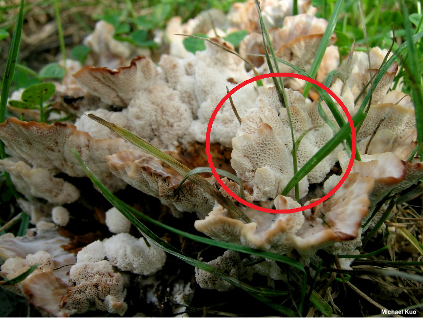 Indeed, Michael Kuo’s description of Abortiporus biennis supports that conclusion: “Two distinct forms of Abortiporus biennis can be encountered: a ‘normal’ looking, regular sort of polypore with a brown cap and a whitish pore surface […] and a gnarled, messy-looking, ‘aborted’ form that consists of a mass of irregular white pores that exude a reddish juice and bruise reddish brown; in this form there is hardly a cap or a stem to speak of…” (4) And while Mr. Kuo’s pictures include nothing quite as extensively finger-like as the form Nate and I saw, there’s definitely some fleshy protrusions with the same pore texture as in my photos.
